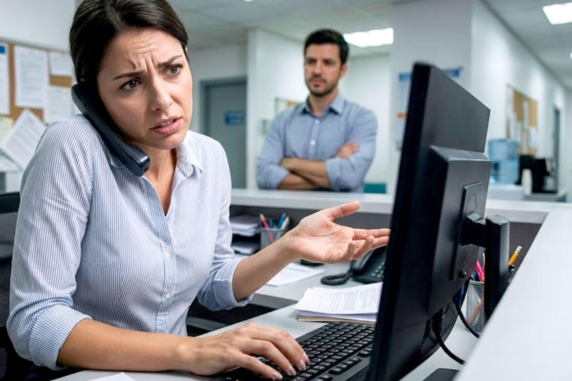 O que você vê? Provavelmente, você verá cabeças baixas, olhos fixos na tela do computador e dedos frenéticos no teclado. O telefone toca, elas atendem enquanto digitam. O WhatsApp apita, elas alternam janelas (Alt+Tab) e copiam dados de um lado para o outro.